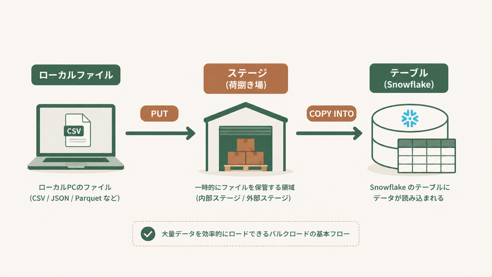 Snowflakeにデータを取り込むとき、いきなりテーブルに流し込めるわけではありません。CSVやJSONなどのファイルを一度どこかに置いて、そこからテーブルにロードするという流れになります。この「いったん置く場所」がステージ (Stage) です。