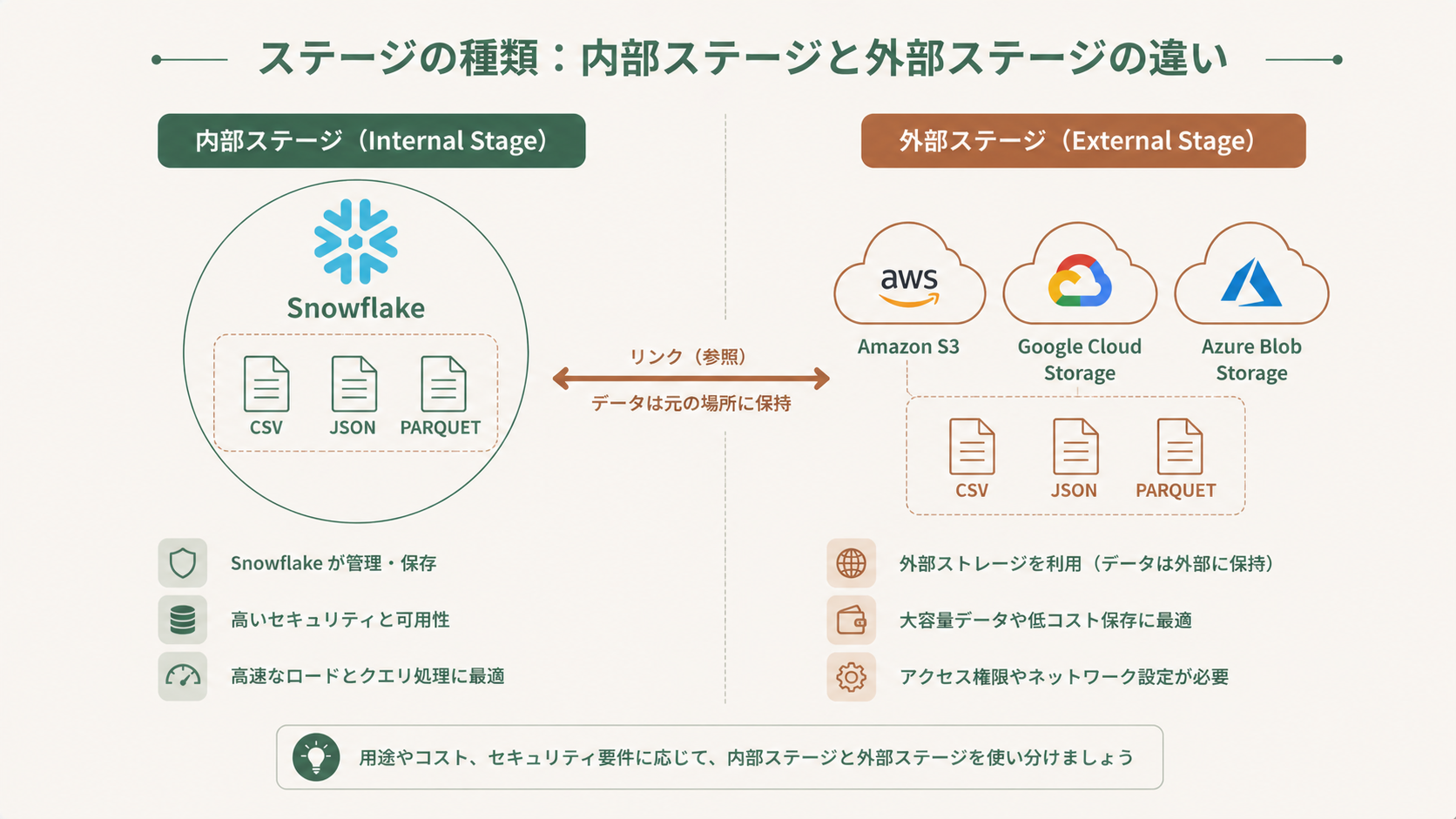 Snowflakeのステージは、大きく分けて内部ステージと外部ステージの2種類があります。