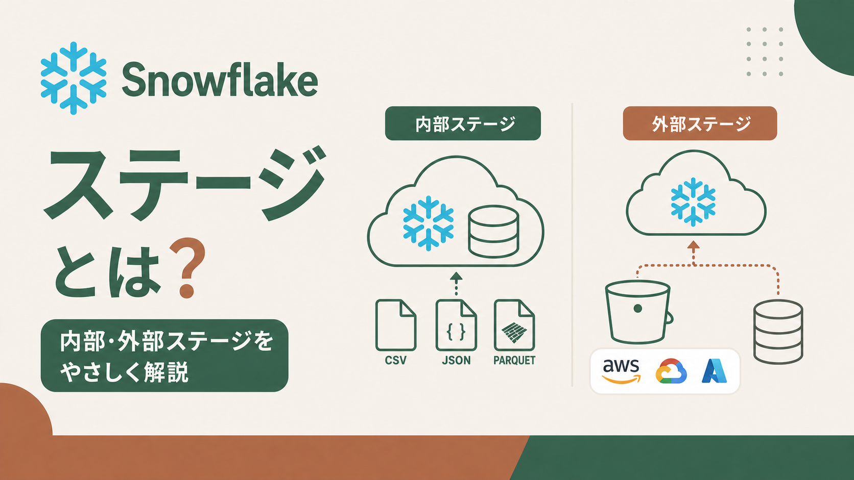 引っ越しに例えると、引越し先の部屋(テーブル)にダンボール(ファイル)を運び込む前に、いったん玄関先や荷捌き場に荷物を置きますよね。ステージはまさにその荷捌き場のような存在です。この記事では、Snowflakeの内部ステージと外部ステージの違い、作り方、使い方を初心者向けにやさしく解説します。