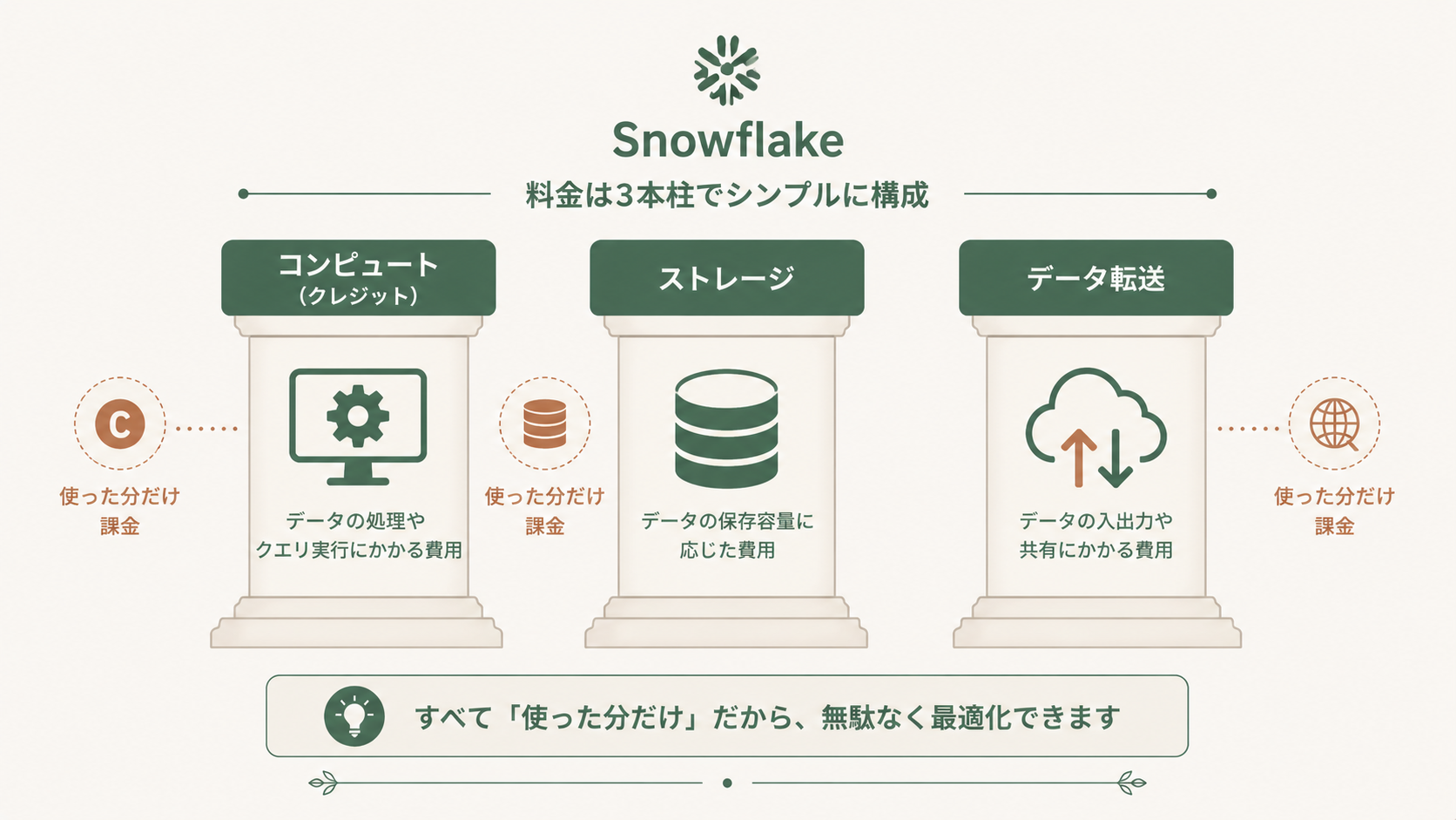 でも安心してください!Snowflakeの料金は大きく分けて「コンピュート(クレジット)」「ストレージ」「データ転送」の3つだけ。この3本柱さえ押さえれば、コスト感覚はバッチリつかめます。今日はこの仕組みをやさしく解説していきますね。