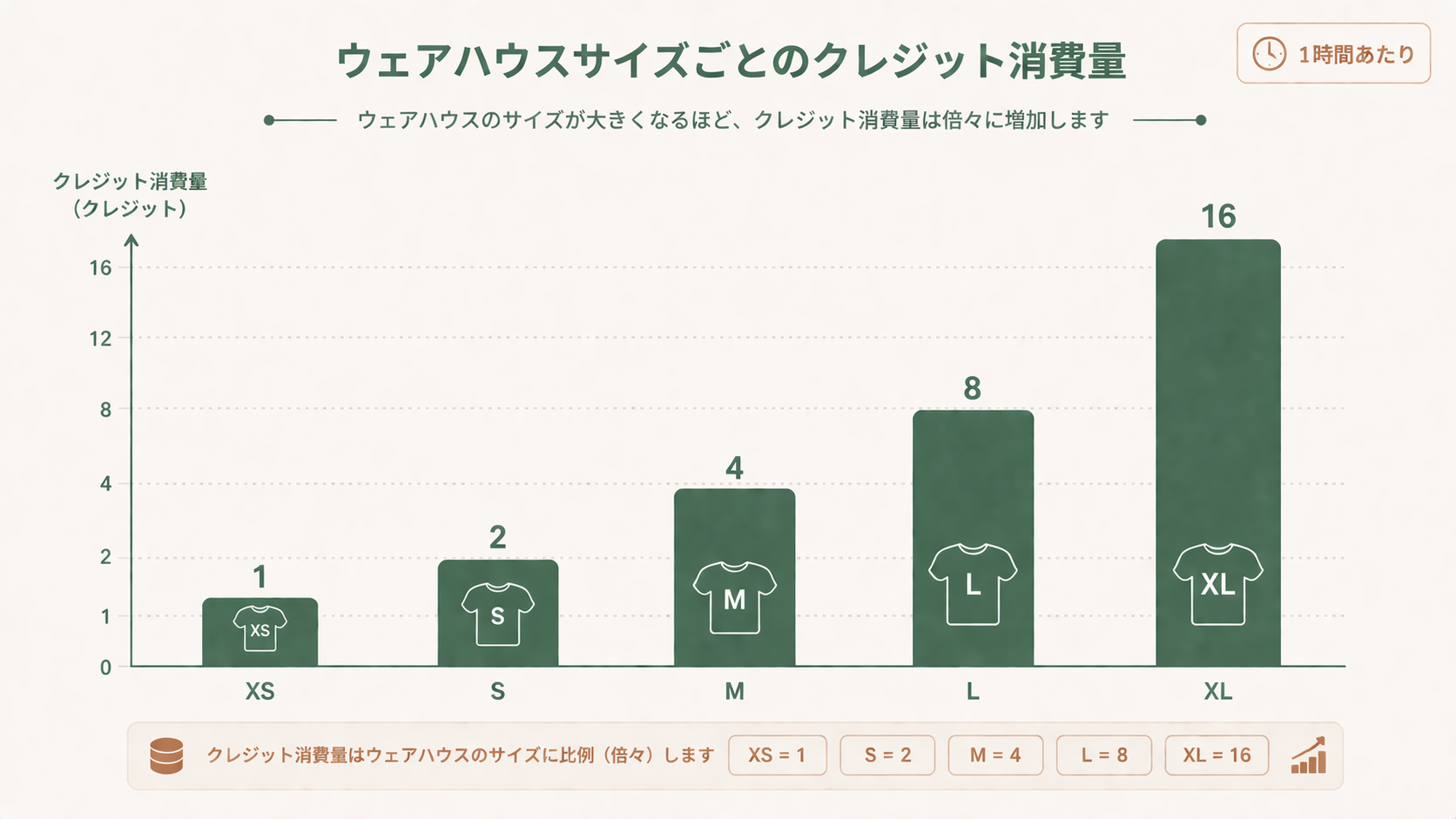 たとえばXSサイズなら1時間あたり1クレジット、Sサイズなら2クレジット、Mなら4クレジット…と、サイズが上がるごとに倍々で増えていきます。ウェアハウスのサイズについて詳しく知りたい方はSnowflakeウェアハウスとは?サイズと使い分けを初心者向けに解説もチェックしてみてください。